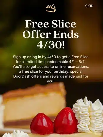 Download and log into the Cheesecake Factory app (Apple or Android) before April 30 and you get a free slice of cheesecake or layer cake between April 1 – May 7, 2026 with any purchase, You'll need to make a free rewards account with them as well, if you haven't already. Doing so will trigger their annual birthday freebie of another free slice with any purchase during your celebratory month.