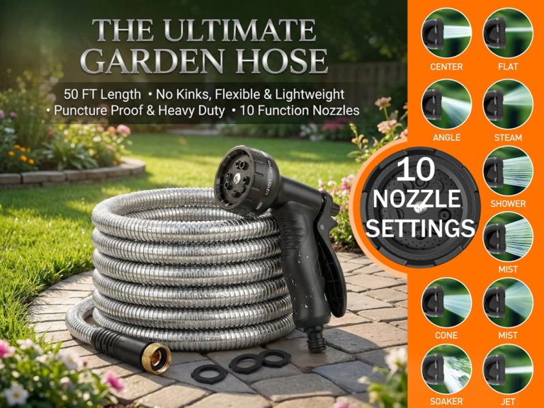 Upgrade your gardening experience with a hose designed for durability and convenience. Made from high-quality stainless steel and thickened PVC, it's resistant to breaking under pressure and withstands pet bites, cactus punctures, and rough surfaces without rusting, bursting, leaking, tearing, or corroding. Its flexible, anti-kink design ensures a steady and uninterrupted flow of water, making it easy to maneuver around iron fences, rose bushes, and corners. The upgraded connector design features extended large aluminum connectors and an extra-long soft shell, making it lightweight yet sturdy.